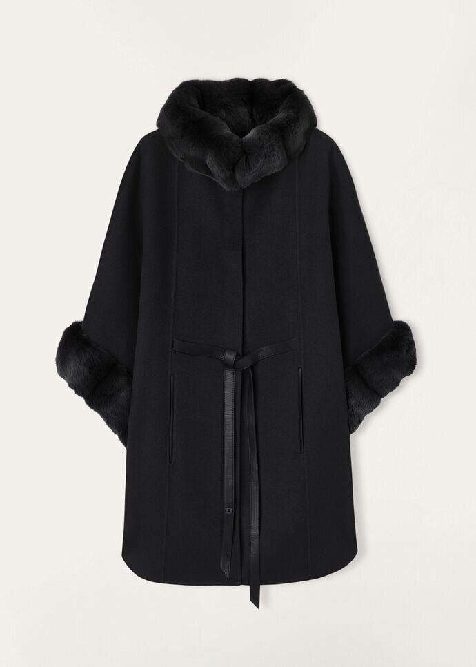 Iconic cape in cashmere double with detachable collar and cuffs in chinchilla fur. Below hip length, styled with a classic cut. It can be worn with the plongé leather belt to highlight the waist, or without for a softer, more flowing line. Elegant and refined, ideal with formal looks.