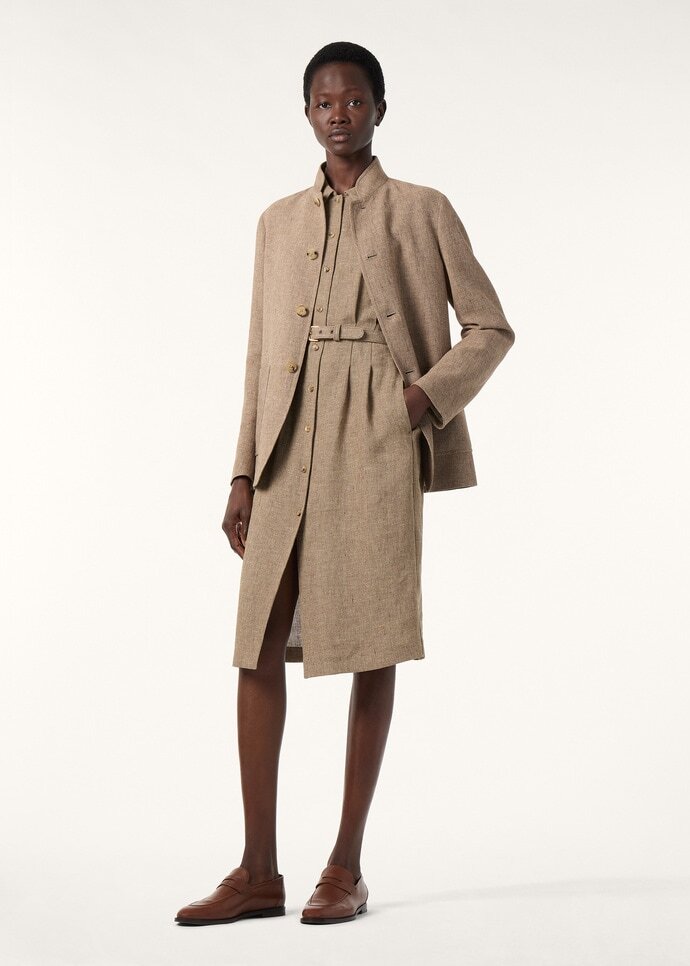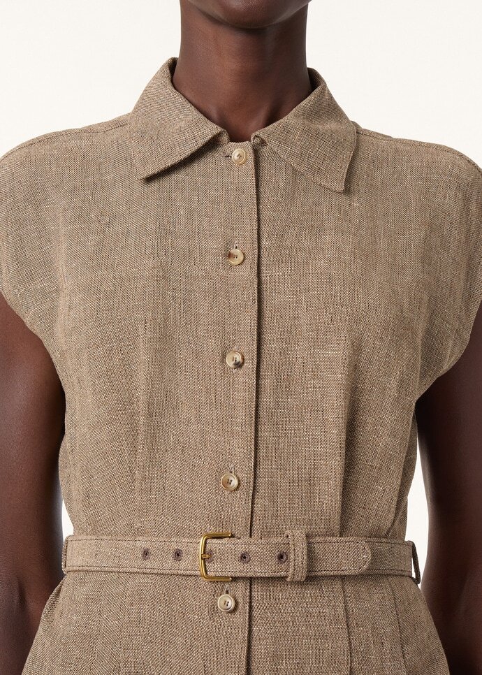 Imbued with a sense of effortless ease, the Maize dress is cut from linen in a satin weave that lends a smooth rippling finish. The sleeveless silhouette is framed by wide shoulders and a crisp collar, imparting balance and structure. It is shaped with soft vertical pleats that are gathered at the waist and subtly defined by a slim calfskin belt.