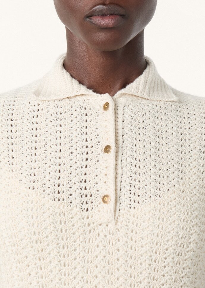 Tactile and refined, the Arola dress is knitted from Cashmere with abaca, a banana leaf fiber which adds natural resilience and structure to the delicate base yarns. The design is shaped with a slim bodice that flares into a feminine line. For added charm, the neckline and collar placket are traced with a delicate crochet trim.