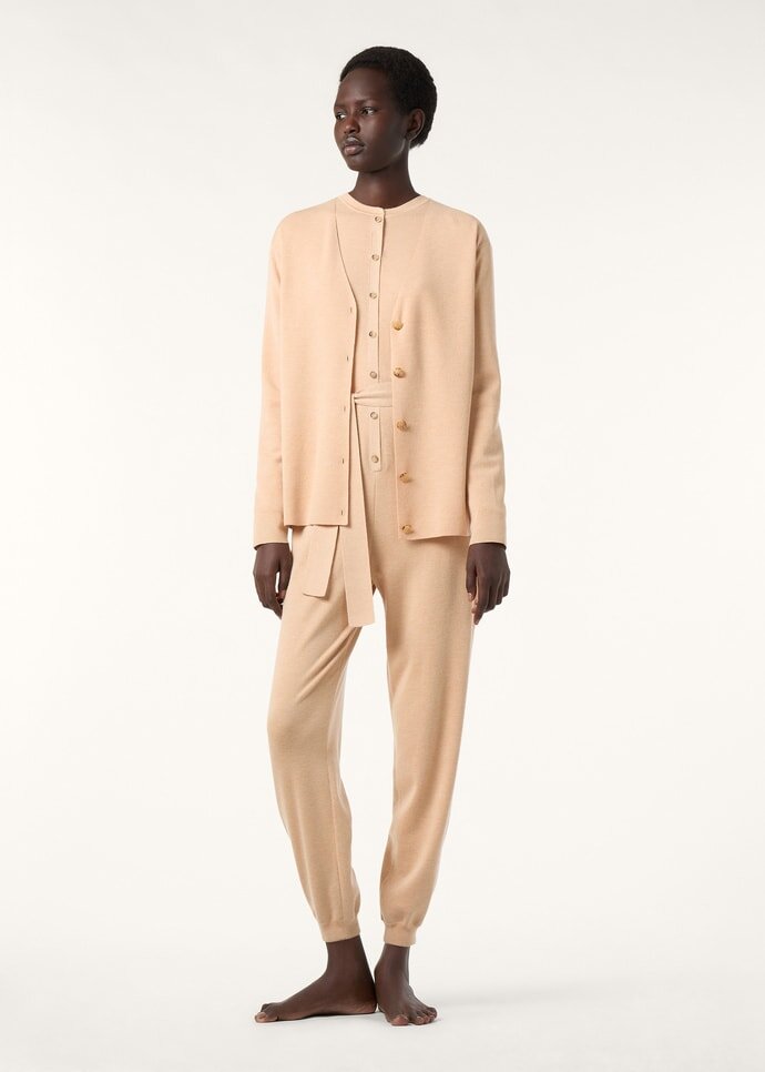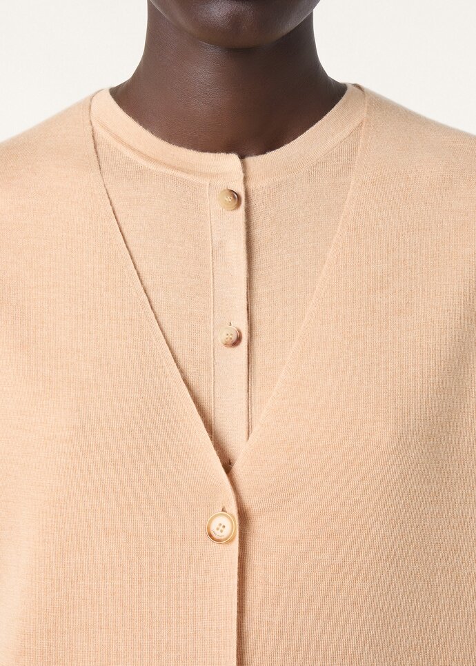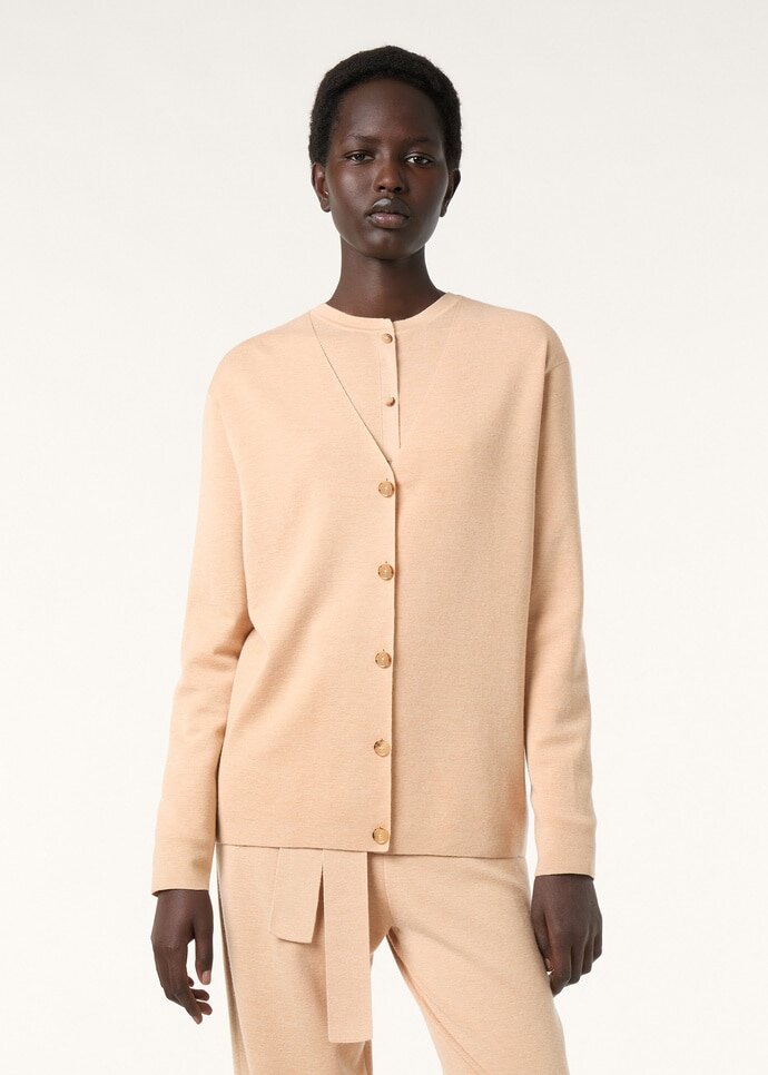 Contoured by relaxed, clean lines, the Cocooning cardigan melds ease with quiet refinement. It is crafted from a fine worsted-spun yarn, made with natural-hued cashmere and mulberry silk for a fluid, soft, and enveloping feel. A row of Sergio horn buttons traces the front to give a polished note.