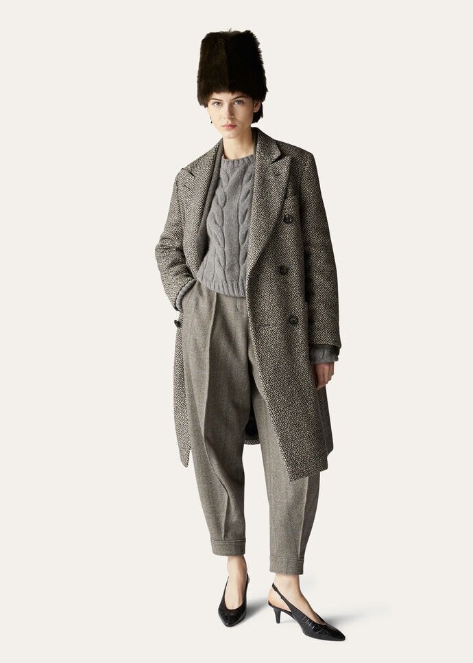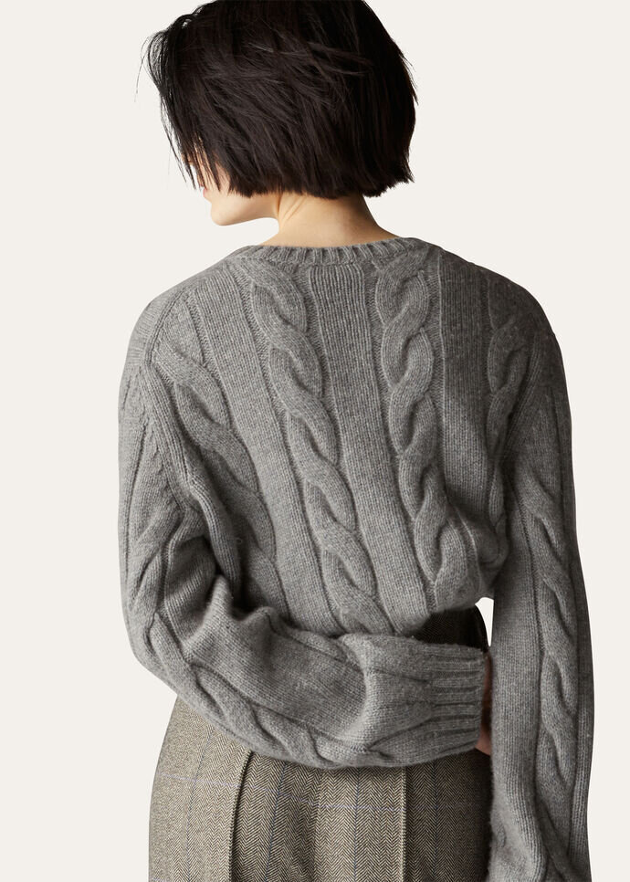 Cropped crewneck made from Coarsehair® baby cashmere mélange yarn. The weave is enhanced by an extremely soft, fluffy textured knit pattern, accentuating the cashmere’s naturally light weight. This flowing, cozy style is defined by a boxy cut.