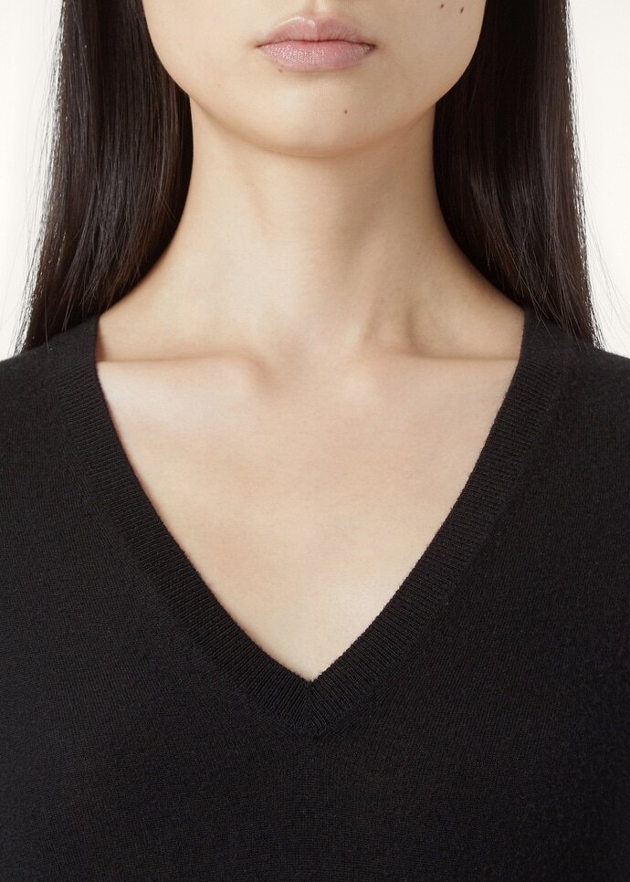 V-neck sweater made from extremely lightweight, plain-knit cashmere yarn. Its comfortable, minimalist cut and slightly elongated regular fit is perfect under a jacket.