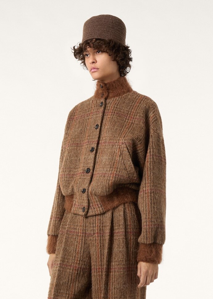 With rich texture and refined detailing, the Andrea bomber jacket provides an elevated take on a classic style. It is made from a tactile wool blend fused with fleecy alpaca and finished for a smooth, sensorial touch, with mohair knit trims framing the collar, hem, and cuffs. Considered accents—including welt pockets and a silk lining—lend a sense of refined function.
