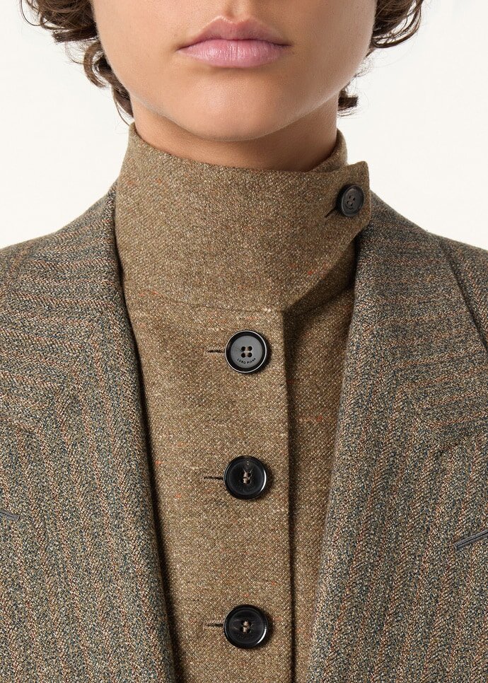 Shaped with a high, asymmetrical neck tab, the Leman vest masters the art of layering through thoughtful construction. It is tailored from a refined blend of cashmere and Wish® wool with touches of silk, revealing a natural mélange of nuanced hues. At the front, welt pockets and heirloom Sergio horn buttons add distinction to the fully lined design.