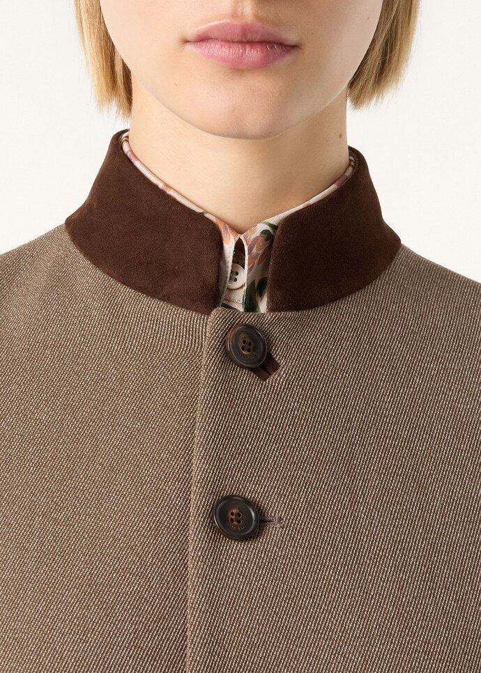 Shaped with a classic standing collar, the Talia from the Loro Highlands Capsule collection is styled with tailored lines that feel composed yet relaxed. It is crafted from mouliné wool, woven with twisted yarns to create a softly textured surface. Suede trims frame the collar and welt pockets with refined polish.