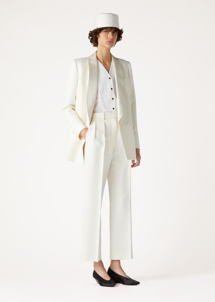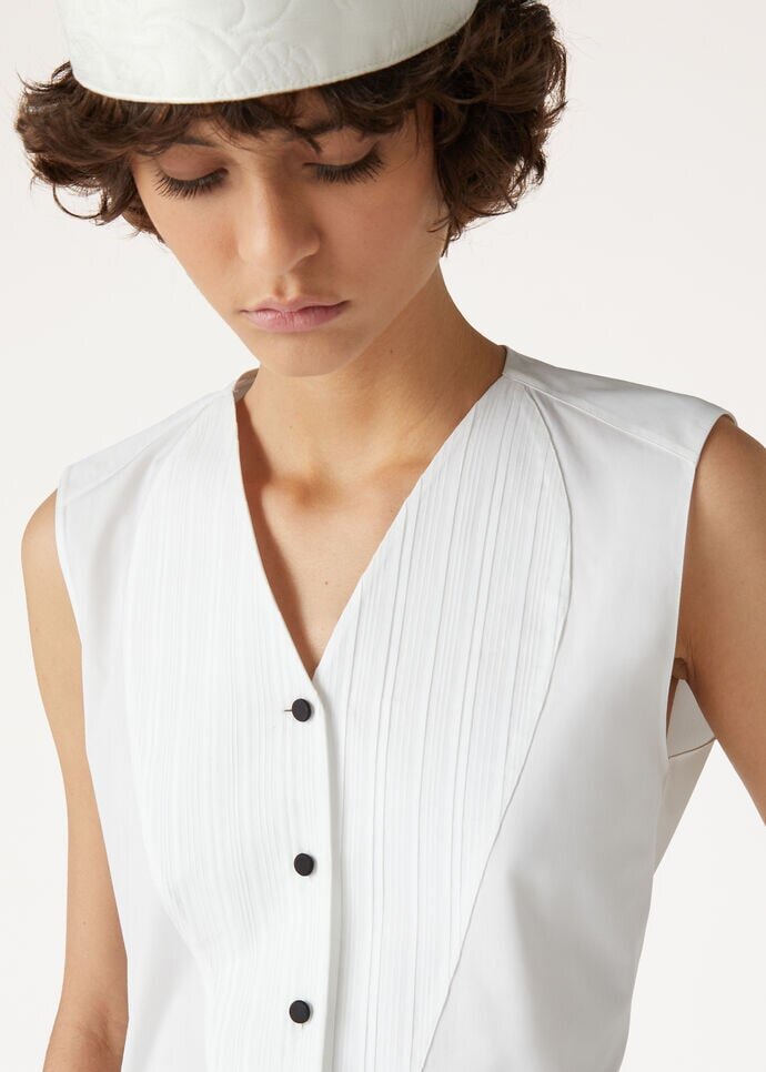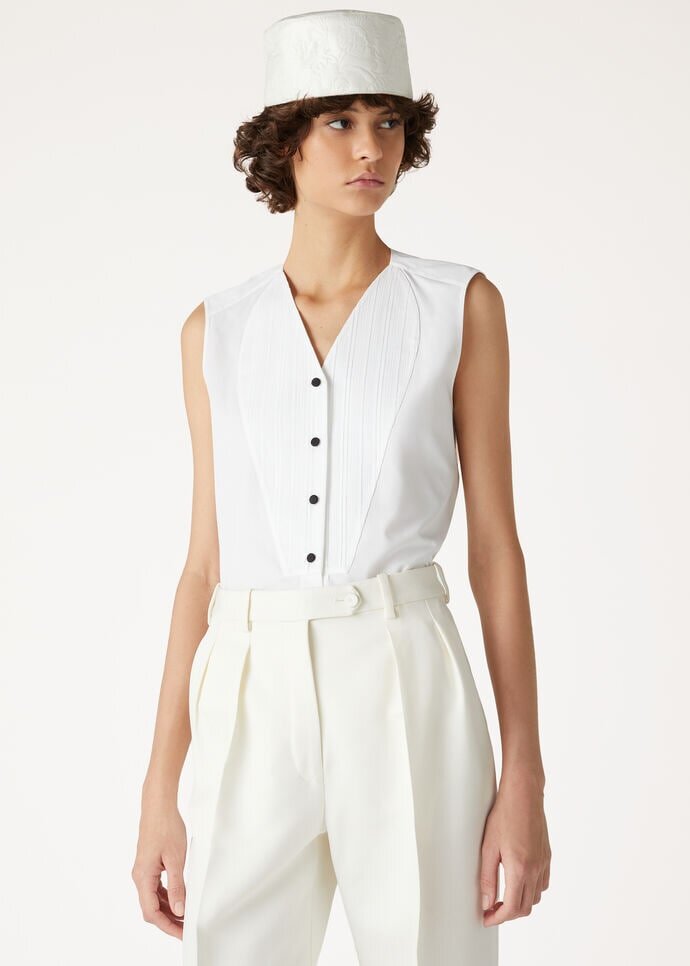 In the soft glow of the evening, the Caylee top emerges as a vision of refinement untouched by the passing of time. This sleeveless cotton-poplin blouse is a statement of elegance, its V-neckline framing a refined pleated bib in a lustrous silk blend that catches the light with subtle sophistication. Silk-covered buttons add a further touch of luxury.