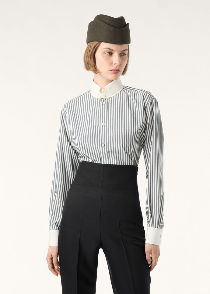Brimming with classic tailoring cues, the Thea shirt is a refined wardrobe essential. It is woven from pure silk with a subtle striped motif. The straight profile falls neatly to the hip, framed by a spread collar and traditionally finished cuffs that lend the piece discreet definition.