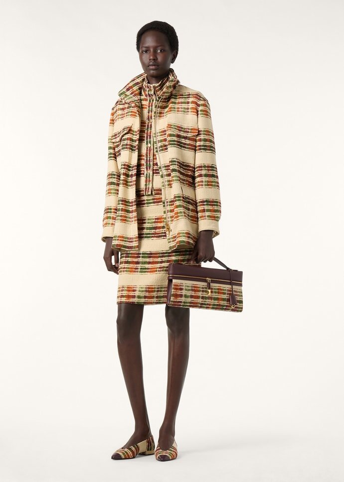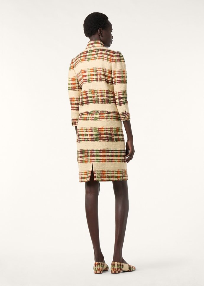 Crafted to match the jacket in the same fabric, the Sylva skirt is rendered in wool bouclé with the Suitcase Stripe. The motif is interpreted in soft watercolor shades—with each stripe initially hand-painted for a fluid finish. Complete with a contrasting silk waistband, the garment is designed for a close-fitting line that ends just above the knee.