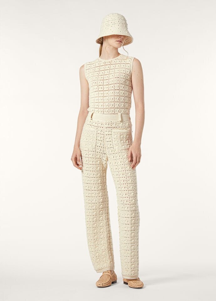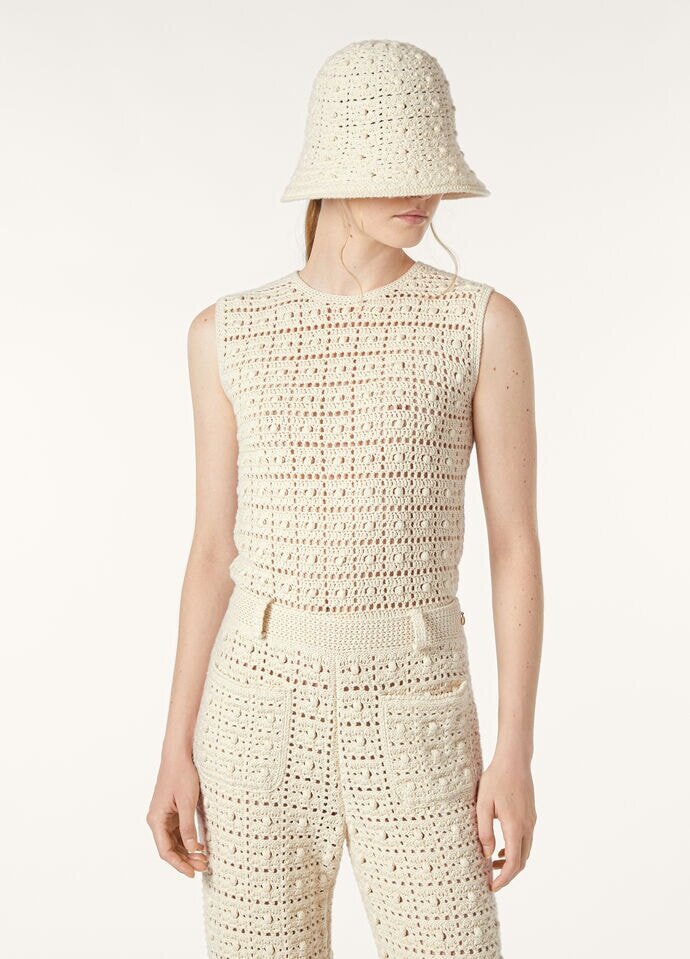 An essential garment for the everyday, the Arola top has a slightly cropped profile and neat, sleeveless design. It is traced with a unique checked motif, amplified by its unique fabrication. The innovative blend combines precious cashmere with touches of abaca—a type of banana leaf coveted for its resilience—and is crocheted to enhance its tactile feel.