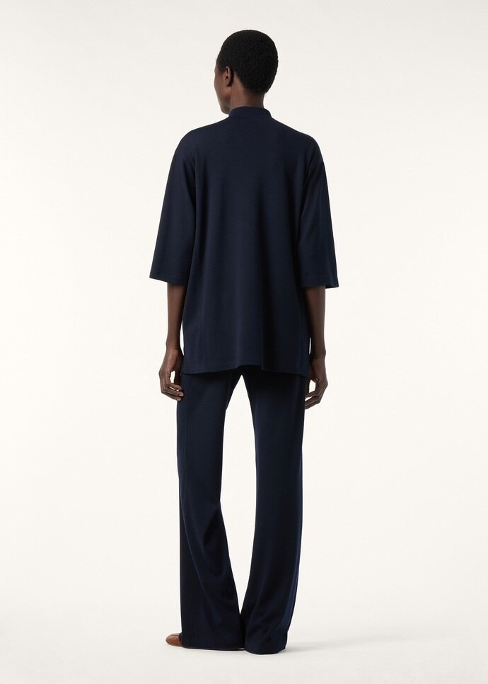 Imbued with a sense of effortless ease, the Leven top is generously cut from refined wool jersey, specially treated to enhance its softness and delicate hand feel. The flowing silhouette is elegantly framed by a knitted mandarin collar and placket, adding a discreet textural contrast. It is finished with light-catching buttons gracing the front as well as side inserts for added ease of movement.