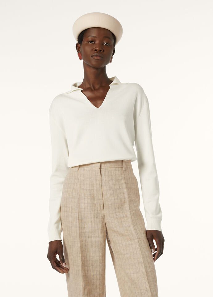 Long-sleeved polo shirt made from cotton and silk. Its minimalist cut and details are enhanced by a classic polo shirt collar with a plunging, buttonless opening, creating a versatile, feminine allure.