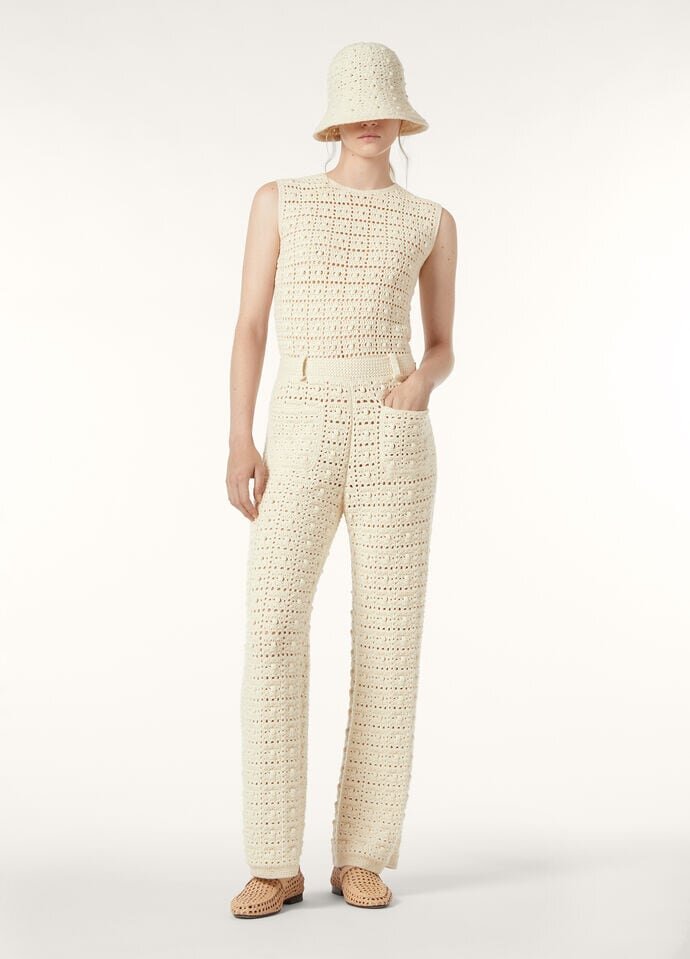 Combining luxury and craftsmanship, these straight-leg knit pants are a discreet statement of elegance. Featuring a mid-rise waist, front patch pockets, side zip and sophisticated three-dimensional check motif, they are crafted from an exceptional blend of cashmere and Abaca. The yarn combines the softness of cashmere with the durability of Manila hemp, creating an extraordinarily tactile sensation with a contemporary edge. The structured yarn allows for intricate low-fineness crochet stitches, giving the pants their unique texture. With a regular fit and ankle-length cut, these pants offer both sophistication and comfort. Ideal for those who appreciate understated luxury and artisanal excellence.