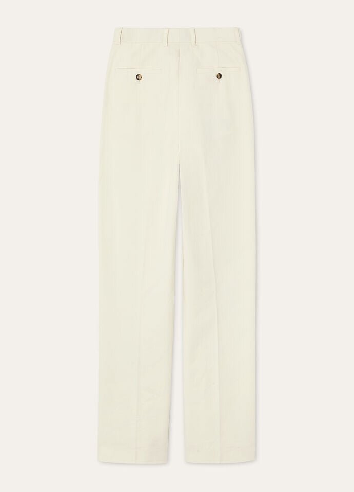Lending a sense of minimalist elegance, the Chad pants are reimagined in Hyannis Stretch Cotton for Loro Piana’s Road to Golf Capsule. This special fabric is worked with a satin weave with a touch of stretch, blending comfort with a refined, compact look and smooth hand. The straight-leg silhouette is anchored with a lean waistband from which two pleats extend to create soft volume.