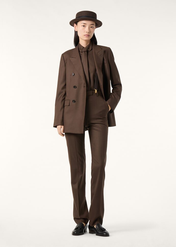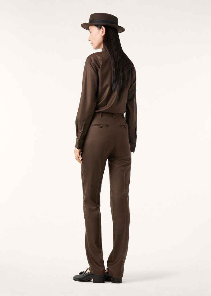 Our women’s pants collection is an exquisite mêlée of masculine and feminine elements, framing the female silhouette in clean, sculpted lines and refined nuances. A symphony of elegance and comfort, these pants in precious wool create a silhouette that is both modern and timeless with their slim cut and relaxed fit at the bottom. Closed with exclusive “Sergio” horn buttons, they are a classic example of Loro Piana’s commitment to excellence and attention to detail.