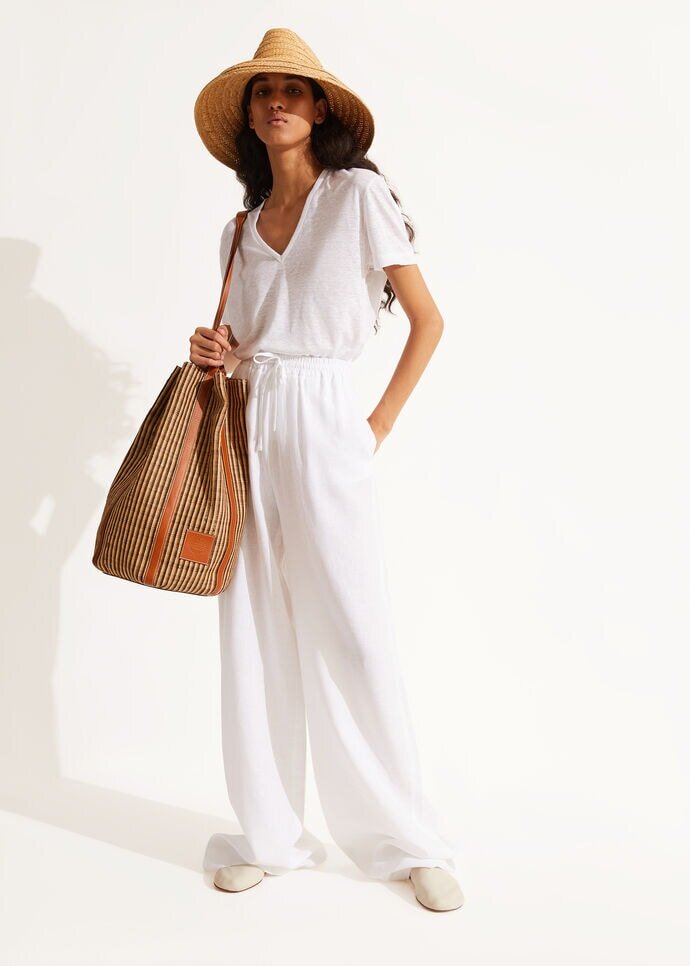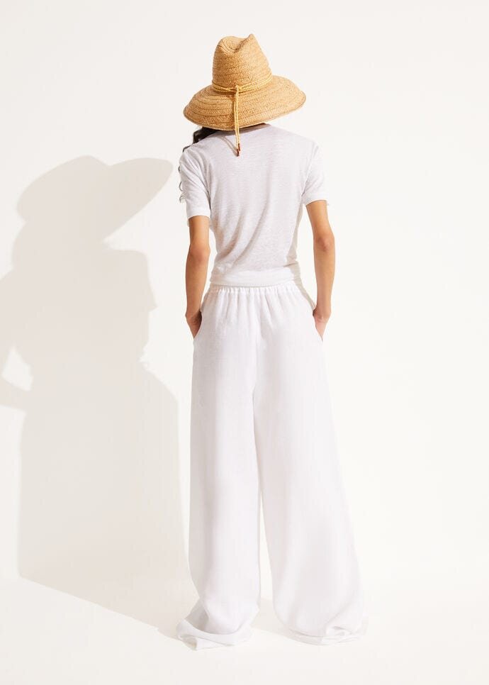 Inspired by lazy days spent lounging on faraway beaches, these relaxed, wide-legged Loro Piana pants are defined by a natural linen fabric weave. The material is treated with a soft aloe finish that resists wrinkles, while providing a flowing drape. A comfortable, loose-fitting style featuring an elastic drawstring waist that is perfect for summertime lounging.