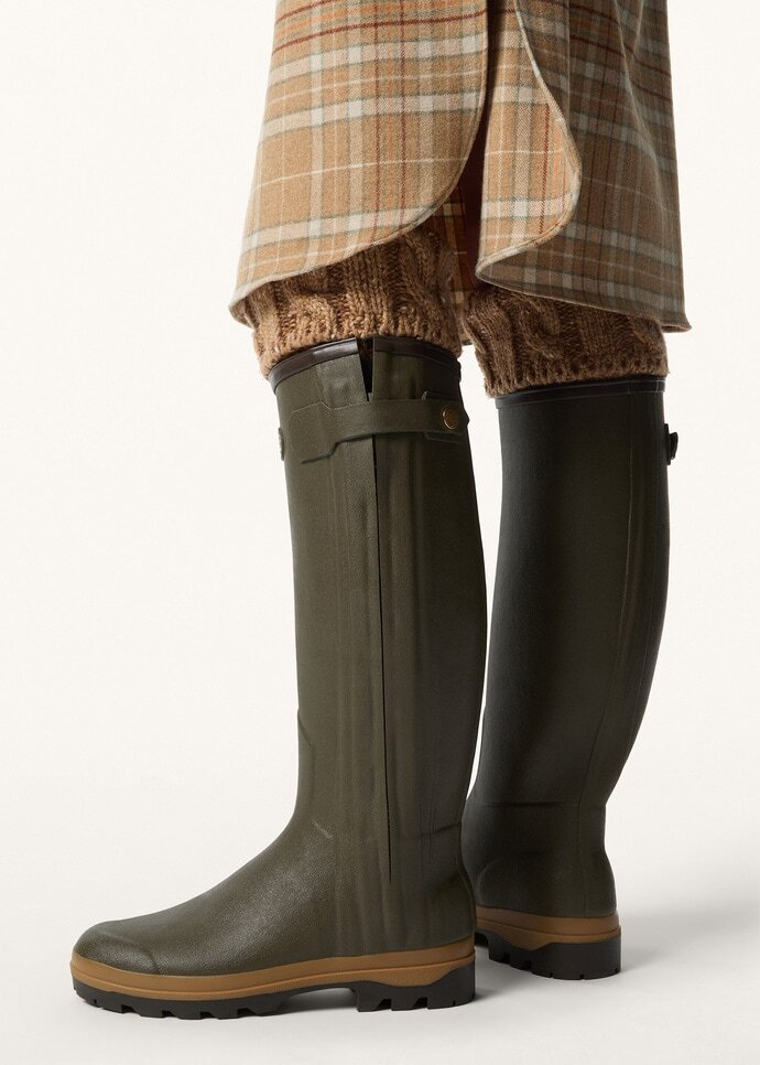The result of two masters of their craft coming together, the Chasseur boot is an essential addition to your cold-weather closet. Crafted for the Loro Highlands Capsule collection in collaboration with Le Chameau, it evokes classic Wellington styles and is hand-made from Chamolux rubber – exclusive to the French house and worked for an effortless fusion of flexibility, softness, and waterproof properties. Sealed with a cashmere jersey lining in the Loro Clan motif, the shoe offers ultimate comfort and protection during shifting weather conditions.