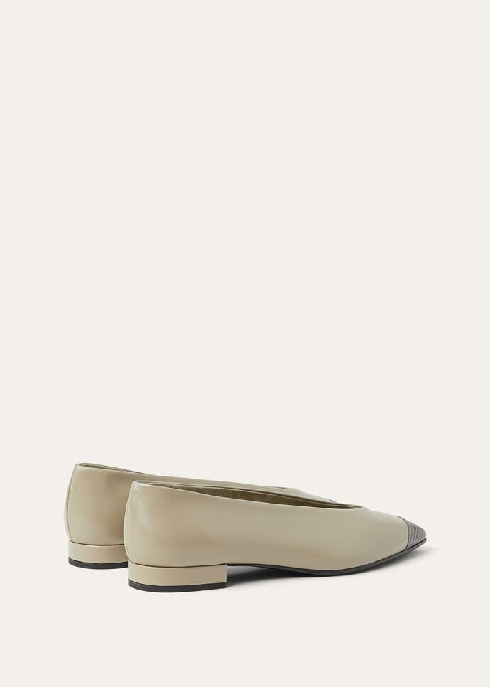 A sophisticated evolution of the Rebecca ballet flat, this version in sumptuous calfskin is detailed with a distinctive pointed toe in supple lizard skin. The feminine silhouette enhances the appeal of this exquisite design. Any wardrobe will benefit from this timeless addition.