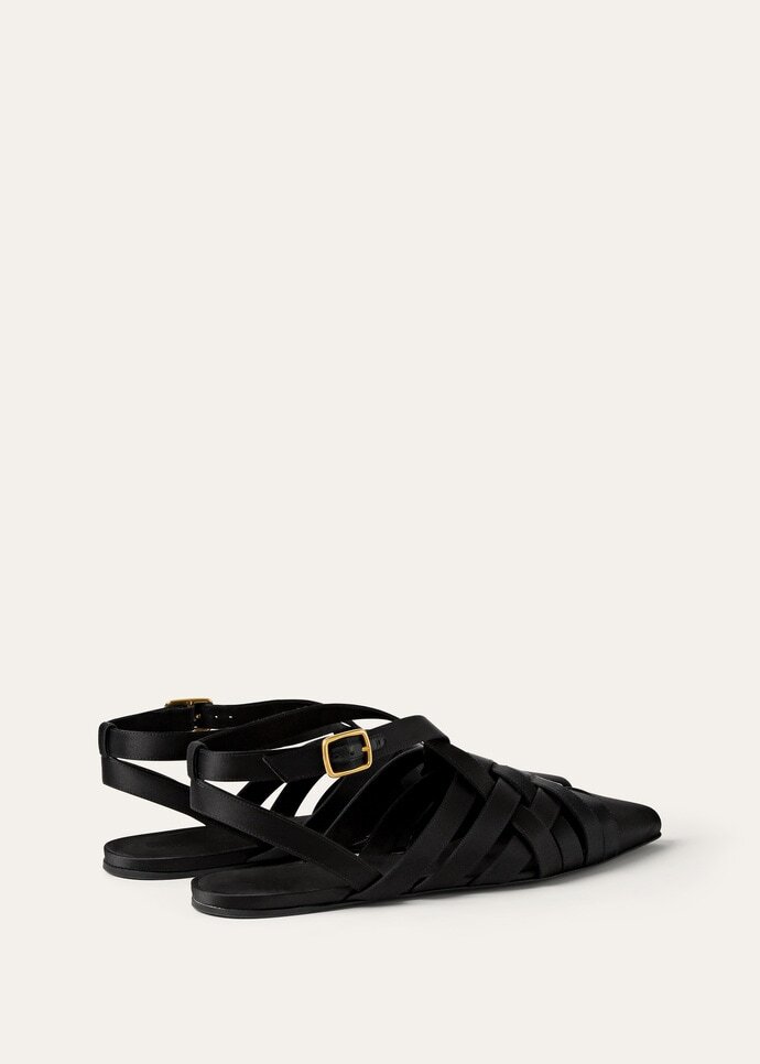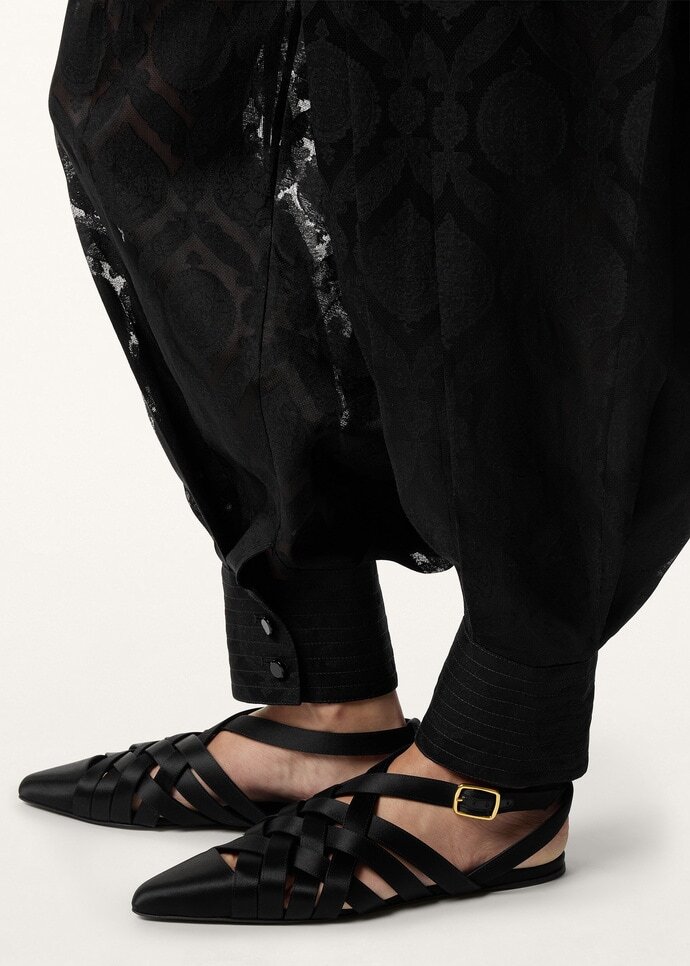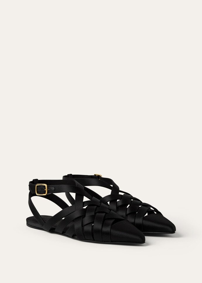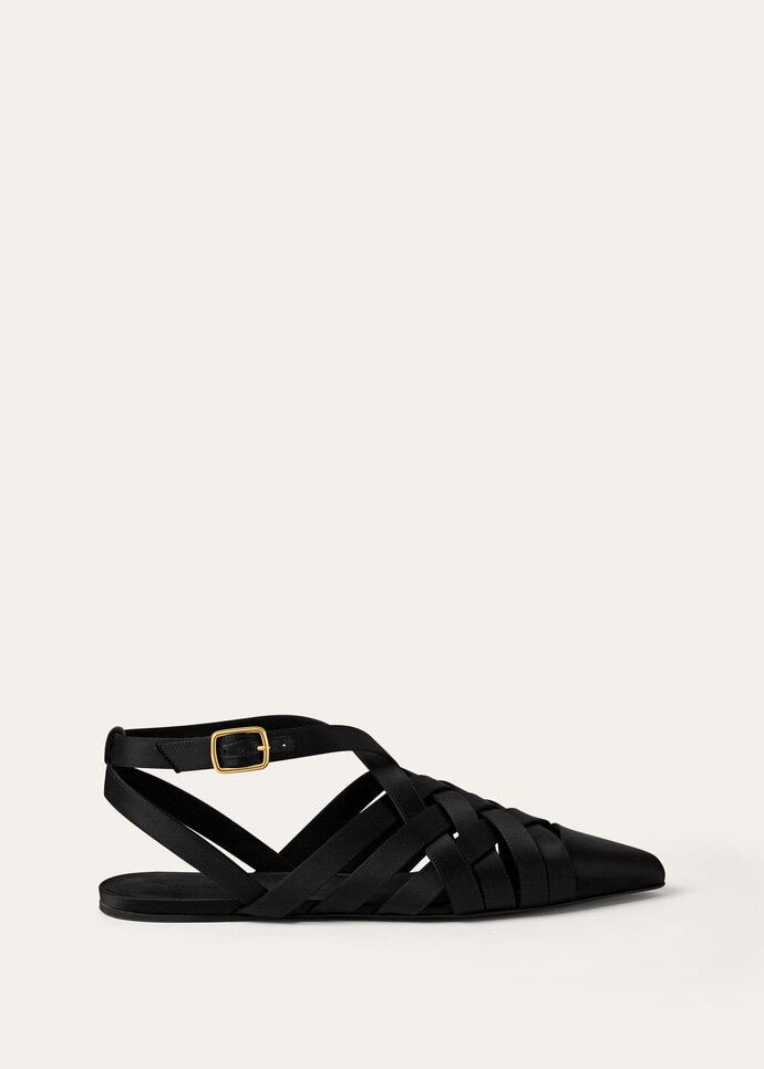 With its intricate cage design, the Silene sandal is primed to complete myriads of ensembles through late summer and beyond. Its straps are wrapped in luminous silk satin, casting a delicate woven pattern. The pair is neatly secured with an ankle strap and balloon-shaped buckle.