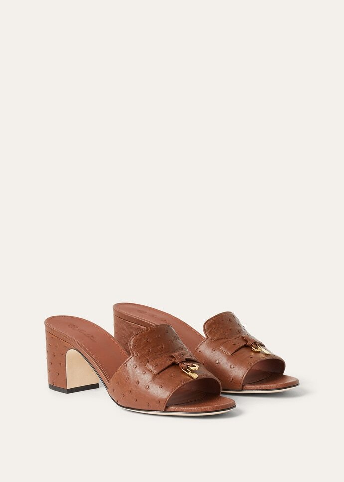 Sandals featuring a wide strap made from soft, meticulously selected ostrich leather, a material defined by its naturally matte surface and irregular grain. Embellished with a front strap featuring miniature My Charms pendants, their design is inspired by the classic Summer Charms Walk loafer.